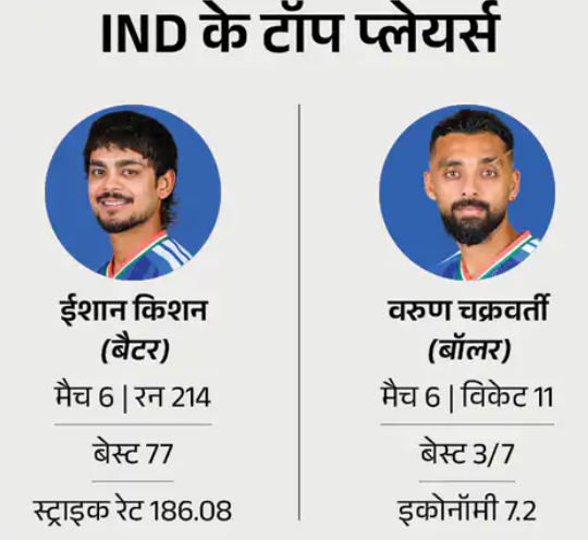 - ईशान किशन: टूर्नामेंट में सबसे ज्यादा रन बनाने वाले भारतीय बल्लेबाज। 6 मैचों में 186.08 के स्ट्राइक रेट से 214 रन।