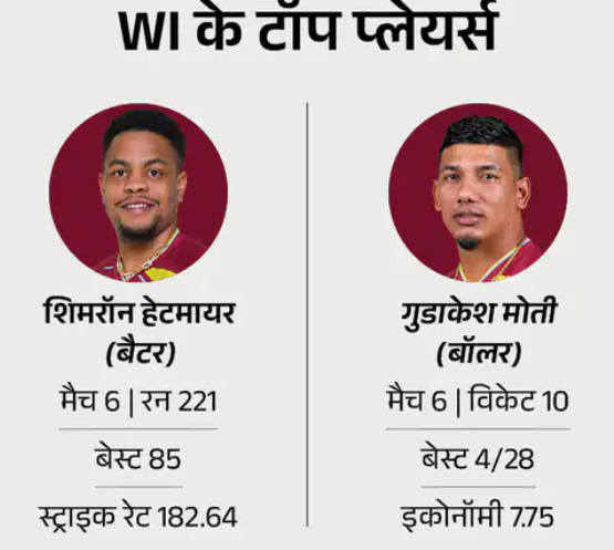 - गुडाकेश मोती: टॉप विकेट टेकर। 6 मैचों में 7.75 की इकॉनमी से 10 विकेट।