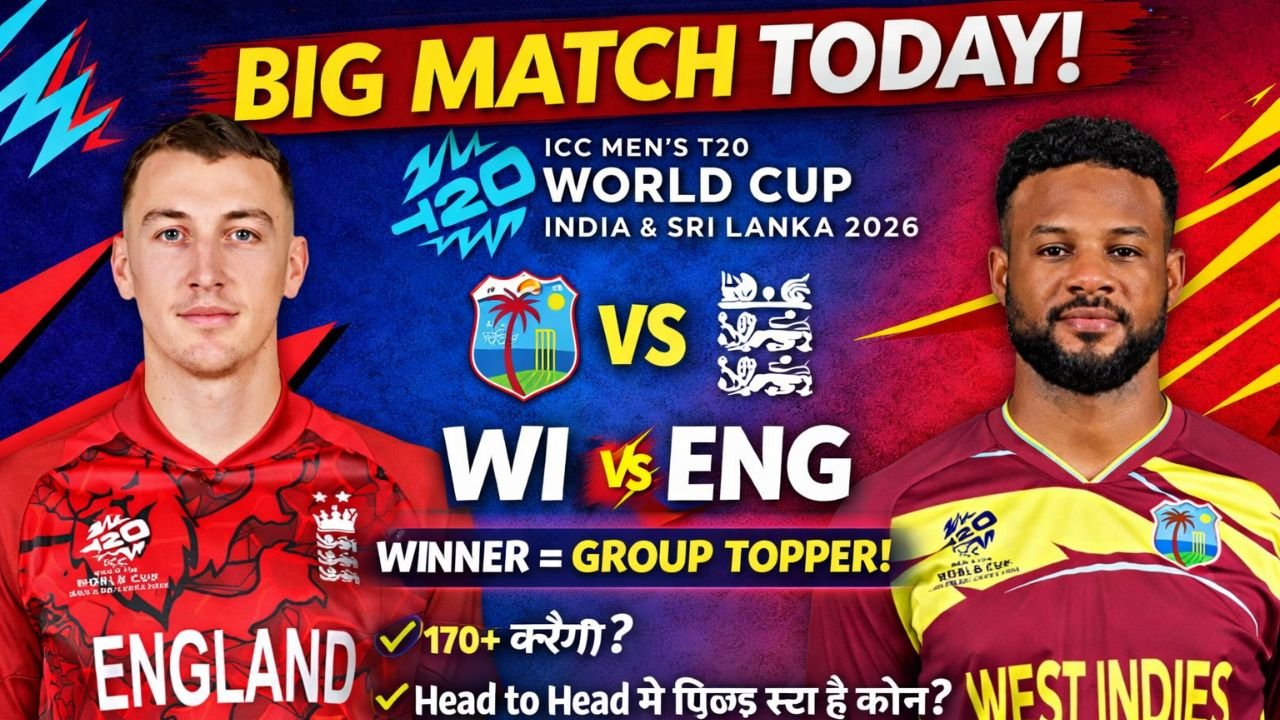 टी20 वर्ल्ड कप 2026 के ग्रुप-सी में आज एक बड़ा मुकाबला खेला जाएगा, जहां वेस्टइंडीज और इंग्लैंड की टीमें आमने-सामने होंगी। यह मैच मुंबई के ऐतिहासिक वानखेड़े स्टेडियम में शाम 7 बजे शुरू होगा, जबकि टॉस 6:30 बजे होगा।